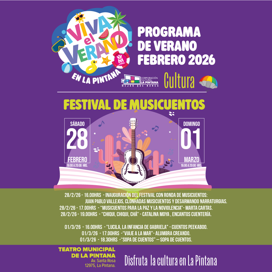 El domingo 1 de marzo seguimos celebrando el Festival de Musicuentos en el Teatro Municipal de La Pintana, con una jornada especialmente pensada para niñas, niños y sus familias 💛